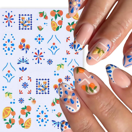 6Pcs Summer Nail Art Stickers 3D Self-Adhesive Orange Lemon Nail Decals Strawberry Blueberry Stickers for Nails Designs Cute Fruit Nail Decor Bohemian French Nail Accessories for DIY Women Manicure