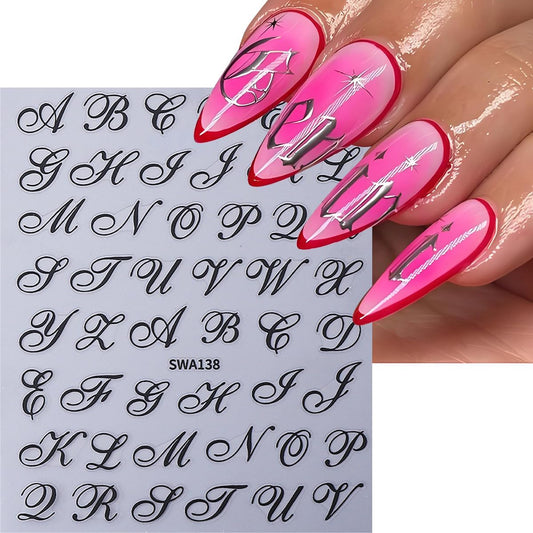 Letter Nail Art Stickers, Old English Letter Nail Art Decals 3D Self-Adhesive Gold Silver Black White Retro English Pattern Nail Design 6Pcs Nail Art Supplies for Women Nail Decoration