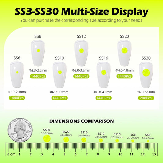 Neon Yellow Flatback Rhinestones, Glass Rhinestones for Nail Art and Craft, Glue Fix, Loose Crystal Gemstones(Neon Yellow, SS8, 1440pcs, 2.3-2.5mm)