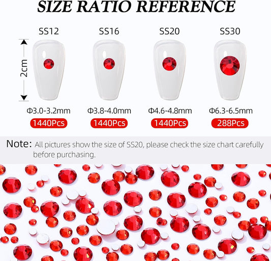 Light Siam Flatback Rhinestones, Glass Rhinestones for Nail Art and Craft, Glue Fix, Loose Crystal Gemstones(Red, SS12, 1440pcs, 2.9-3.0mm)