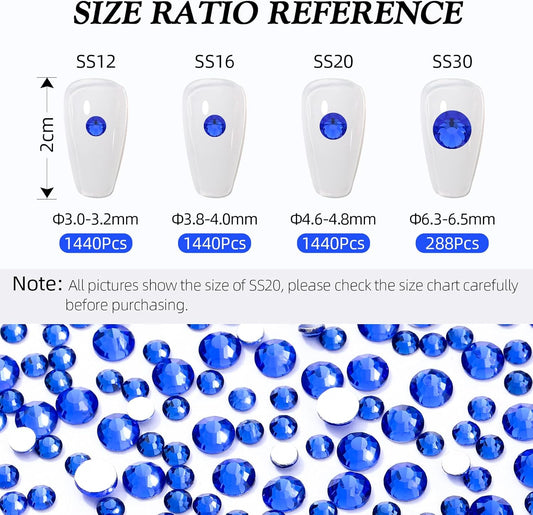 Sapphire Flatback Rhinestones, Glass Rhinestones for Nail Art and Craft, Glue Fix, Loose Crystal Gemstones(Blue, SS12, 1440pcs, 2.9-3.0mm)