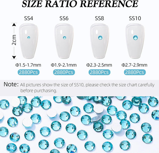 Aquamarine Flatback Rhinestones, Glass Rhinestones for Nail Art and Craft, Glue Fix, Loose Crystal Gemstones(Aquamarine, SS10, 2880pcs, 2.7-2.8mm)
