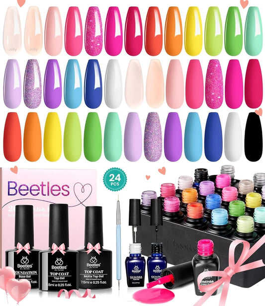 Beetles Summer Gel Nail Polish Set 24pcs Jelly Neon Hot Pink Orange Green Blue Purple Color with White Black Liner Gel Polish and Base Top Coat Nail Art Pen Gifts for Women Fancy Pop