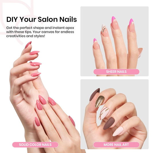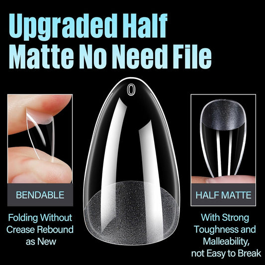 TOMICCA Medium Almond Nail Tips, 504Pcs Soft Acrylic Pre Etched Clear Fake Nails Tips Almond Shape Half Matte, Full Cover Nail Extension for Beginner and Professional 12 Sizes