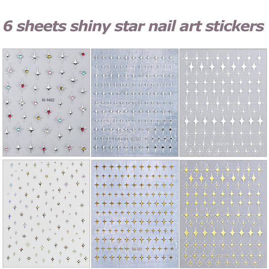 6 Sheets 3D Glitter Shiny Crystal Nail Art Sticker Star Charms Silver Black White Stickers Self-Adhesive Design Luxury Nail Decals for French Manicure