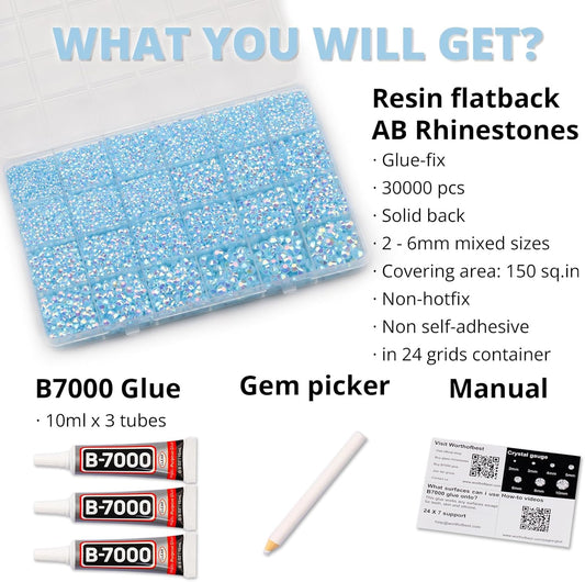 30000Pcs Resin Jelly Rhinestones Set for Crafting Bedazzling, Light Blue AB Flatback Gems Jewels for Crafts Clothes Shoes Fabric Outfit Nails Makeup, Flat Back Crystal 2-6mm with b 7000 Glue