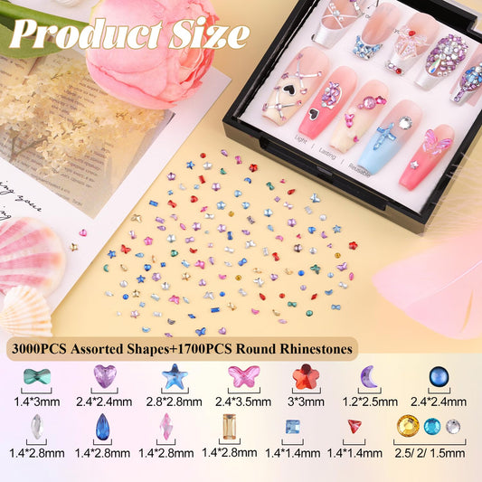 1.2-3 MM 4700 PCS Muliti Shape Colorful Rhinestones for Nail Art, 3D Resin Flatback Bedazzling Gems Mini Flower Bow Heart Star Butterfly, Gems Kit with Tweezers, Pickup Pencil and 15ML Nail Glue