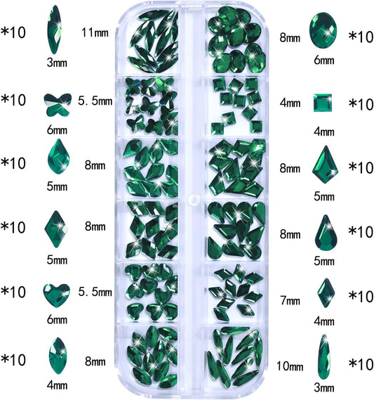 Nail Rhinestones - 3D Multi Shape Size, Flat Back, Crystals Manicure Rhinestones Charms, Green Nail Gems, with Kit, for Nail Art, Bedazzling Acrylic Nails, DIY Decor