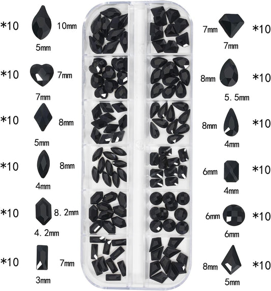 Nail Rhinestones - 3D Multi Shape Size, Flat Back, Manicure Rhinestones Charms, Crystal Black Gems, with Kit, for Nail Art, Bedazzling Acrylic Nails, DIY Decor