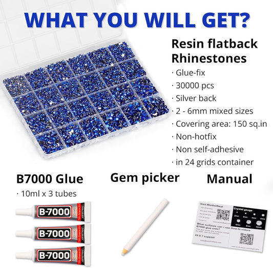 30000Pcs Resin Rhinestones for Crafting Bedazzling, Blue Flatback Gems Crystal for Crafts Clothing Clothes Shoes Fabric Tumblers Cups, Bling Dark Royal Navy Blue Flat Back Jewels with b7000 Glue