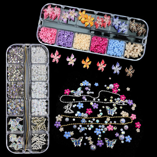 4 Boxes Nail Gems Colorful Flower Nail Charms for Acrylics - Crystals, Half Rounds Flatback Pearls and Rhinestone & Accessories for DIY Nails Art Decor for Women Nails Design
