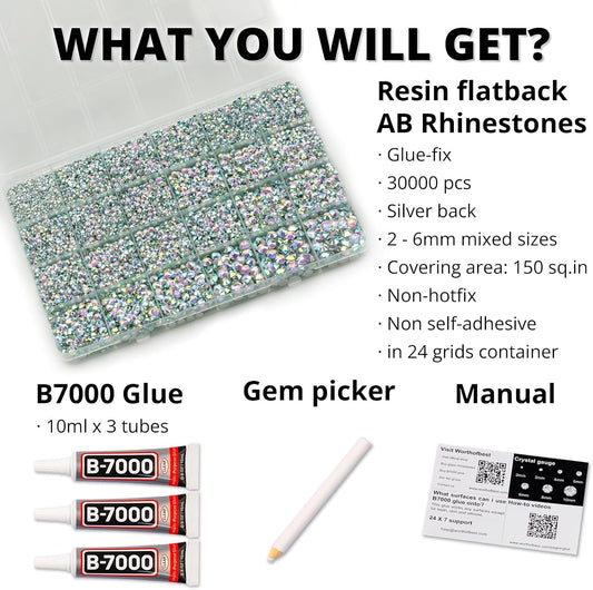 30000Pcs Resin Rhinestones Set for Crafting Bedazzling, Crystal ab Iridescent Flatback Gems Jewels for Crafts Clothes Shoes Fabric Outfit Nails Makeup, Flat Back Crystal 2-6mm with b 7000 Glue