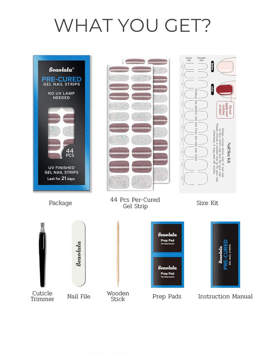 Pre Cured Gel Nail Strips - 44PCS Salon Quality Gel Nail Stickers - Long Lasting Polish Wraps for Women no UV Light Needed Easy Apply& Remove (Smoky Silver)