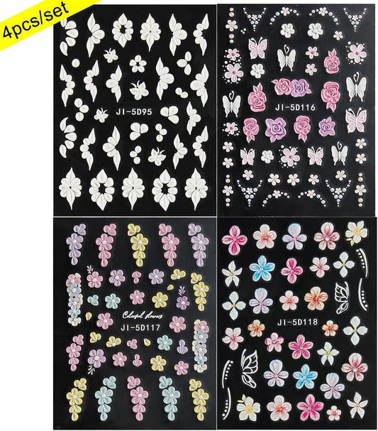 Flowers Nail Stickers 4 Sheets 5D Embossed Floral Nail Decals, Summer Neon Nail Design, 3D Acrylic Engraved Hibiscus Flowers Rose Butterfly Stickers for Nail Art Pegatinas Uñas