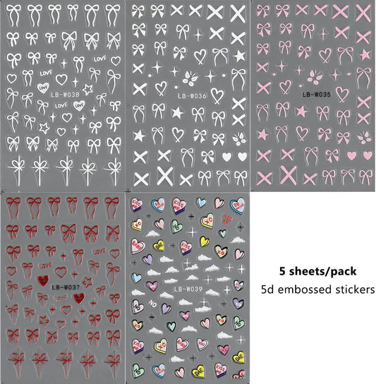 5D Embossed Bow Nail Stickers, 5 Sheets Self-Adhesive Pink White Ribbons Nail Decals, Valentines' Day Nail Art, Heart Nail Charms, Cute Cartoon Pop Art Stickers, Pegatinas para Uñas