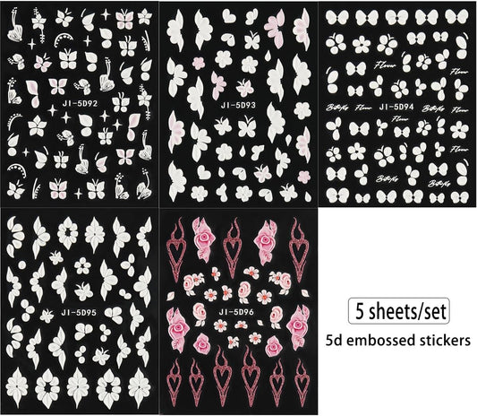 5D Embossed White Flowers Nail Stickers, 5 Sheets Self-Adhesive Floral Nail Decals, Spring Rose Butterfly Nail Art, 3D Acrylic Flowers for Manicure Decor