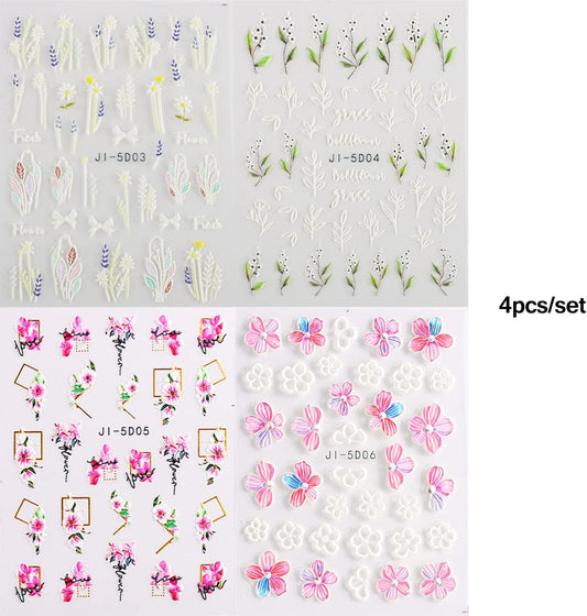 4 Sheets Flower Nail Art Stickers 3D Self-Adhesive Blossom Nails Sticker Spring Nail Art Decals Holographic Daisy Nails Decal Decoration for Women Colorful Flowers Manicure DIY Nail Supplies