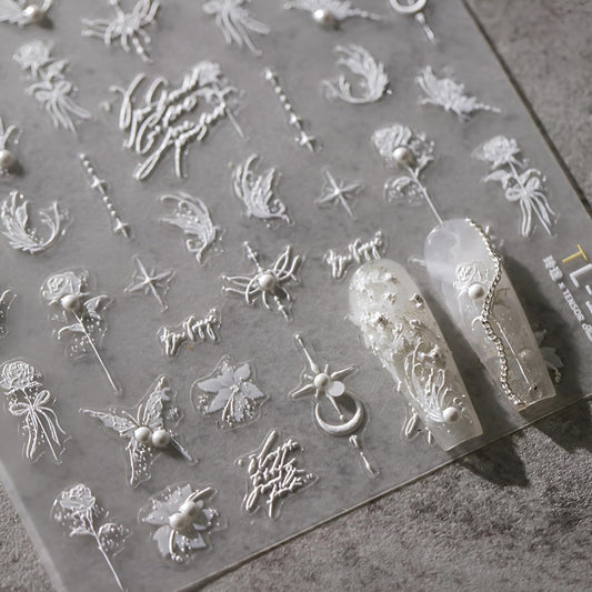 5D Embossed White Butterfly Flower Nail Stickers for Nail Art White Moon Star Nail Art Stickers White Nail Decals with Pearl Design Spring Summer Nail Supplies for Women Girls