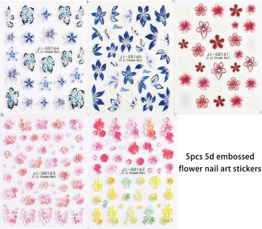 Blue Flowers Stickers for Nails 5D Embossed Flower Nail Stickers Lily Hibiscus Cherry Blossom Rose Floral Nail Decals Self Adhesive Nail Wraps Spring Summer Nails Pegatinas para Uñas 5 Sheet