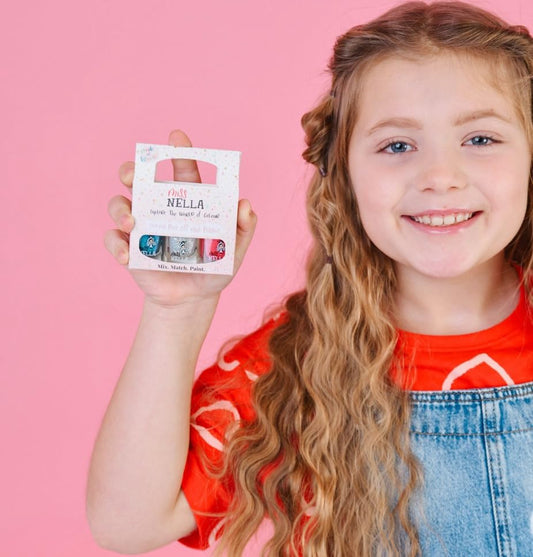 MISS NELLA PARTY COLLECTION 3-3 peel off, odour free, water base glitter nail polishes Pack- Blue The Candles (blue), Confetti Clouds (clear) & Marshmallow Overloud (coral)