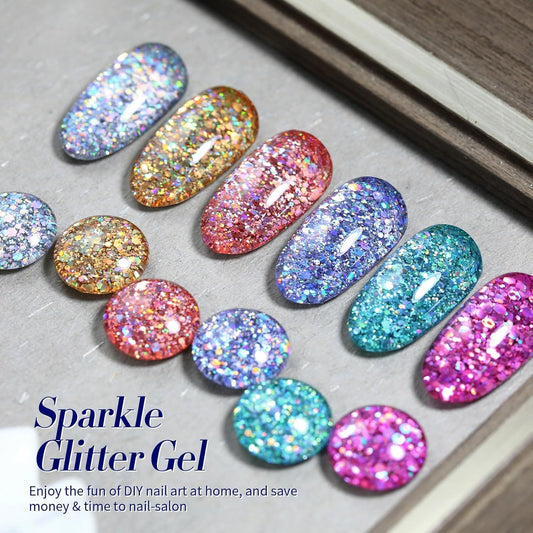 Born Pretty Glitter Gel Nail Polish with Sequins, 6 Pcs Gold Silver Purple Green Blue Hot Pink Long Lasting Sparkly Shiny U V Gel Polish Set for Manicure and Nail Art, DIY at Home, Salon-Quality 7ml