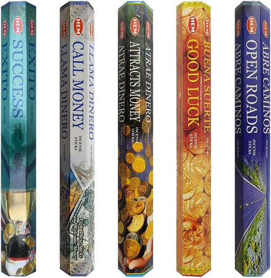 Hem Incense Sticks Variety Pack #5 and Incense Stick Holder Bundle with 5 Money and Success Themed Fragrances
