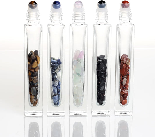 10ml Gemstone Roller Square Bottles Refillable Roll On Bottles Healing Crystal Chips Inside For Perfumes Aromatherapy Oils 5pack…