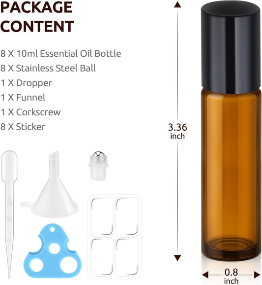 8 Pack 10ml Essential Oil Roller Bottles, Amber Leak-Proof Glass Roll on Bottles, Roller Ball Applicator, Opener, Droppers, Funnel, Labels, Refillable for Perfume & DIY Skincare