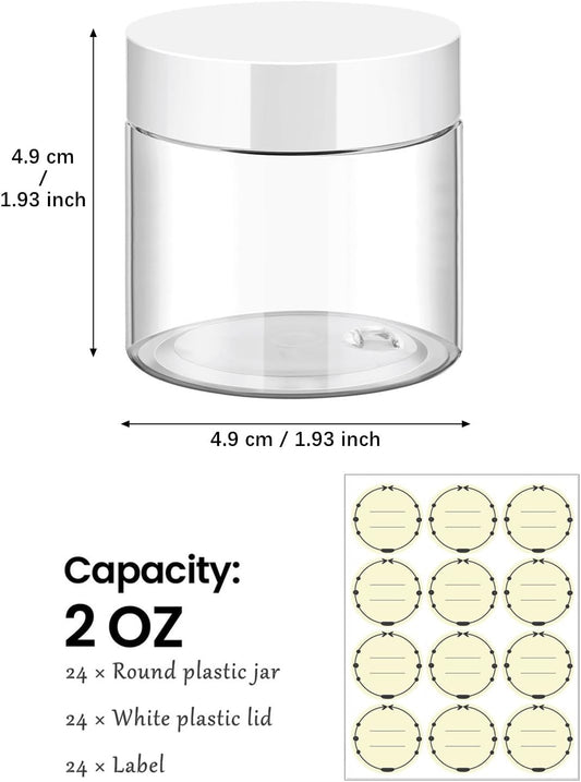 TUZAZO 24 Pack 2 Oz Small Plastic Container Jars with Lids and Labels BPA Free, Empty Round Clear Cosmetic Containers Plastic Slime Jars for Lotion, Cream, Ointments, Samples, Travel Storage (24)