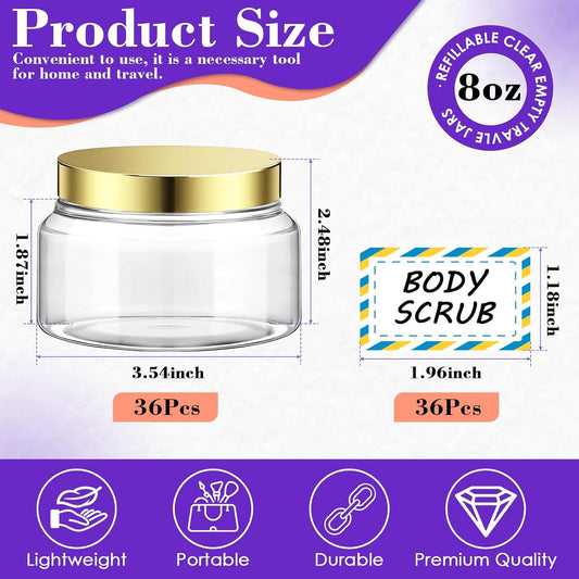 36 Pack 8 oz Plastic Cosmetic Containers With Lids Refillable Clear Empty Travle Jars Containers for Body Butter,Sugar Scrubs,Cream,Lotions,Candy, Waterproof Label&Spatulas - (Rose Gold Lid)