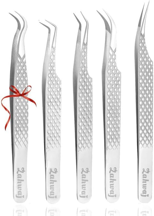 Lash Tweezers - Set of 5 Diamond Grip Eyelash Tweezers - Stainless Steel Professional Fiber Tip Lash Tweezer for Eyelash Extensions (Silver)