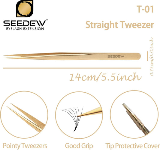 Ms.Queen Eyelash Extension Tweezers Set-Precision Tweezers for 2D-6D Volume&Individual False Lashes Extensions with PU Storage Case-Golden (Straight Tweezers/M003-5)
