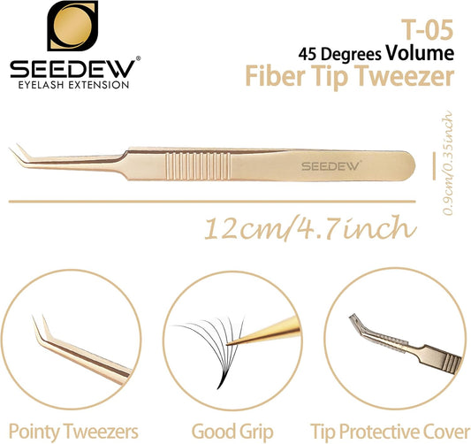 Golden Stainless Steel 45 Degree Angled Volume Tweezer, 1 Pc, T05 Fiber Tip, Precision Eyelash Extension Tool for Lash Tech & Artist