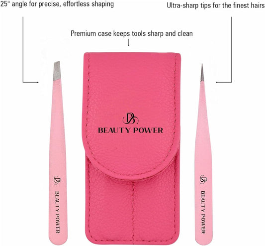 Professional Tweezers Set – Slant & Point, Ultra Precision German Stainless Steel Tweezers for Eyebrows, Chin, Ingrown Hair & Facial Grooming – Lightweight with Travel Case (Pink)