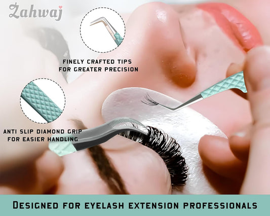 Lash Tweezers - Set of 5 Diamond Grip Eyelash Tweezers - Stainless Steel Professional Fiber Tip Lash Tweezer for Eyelash Extensions (Light Green)