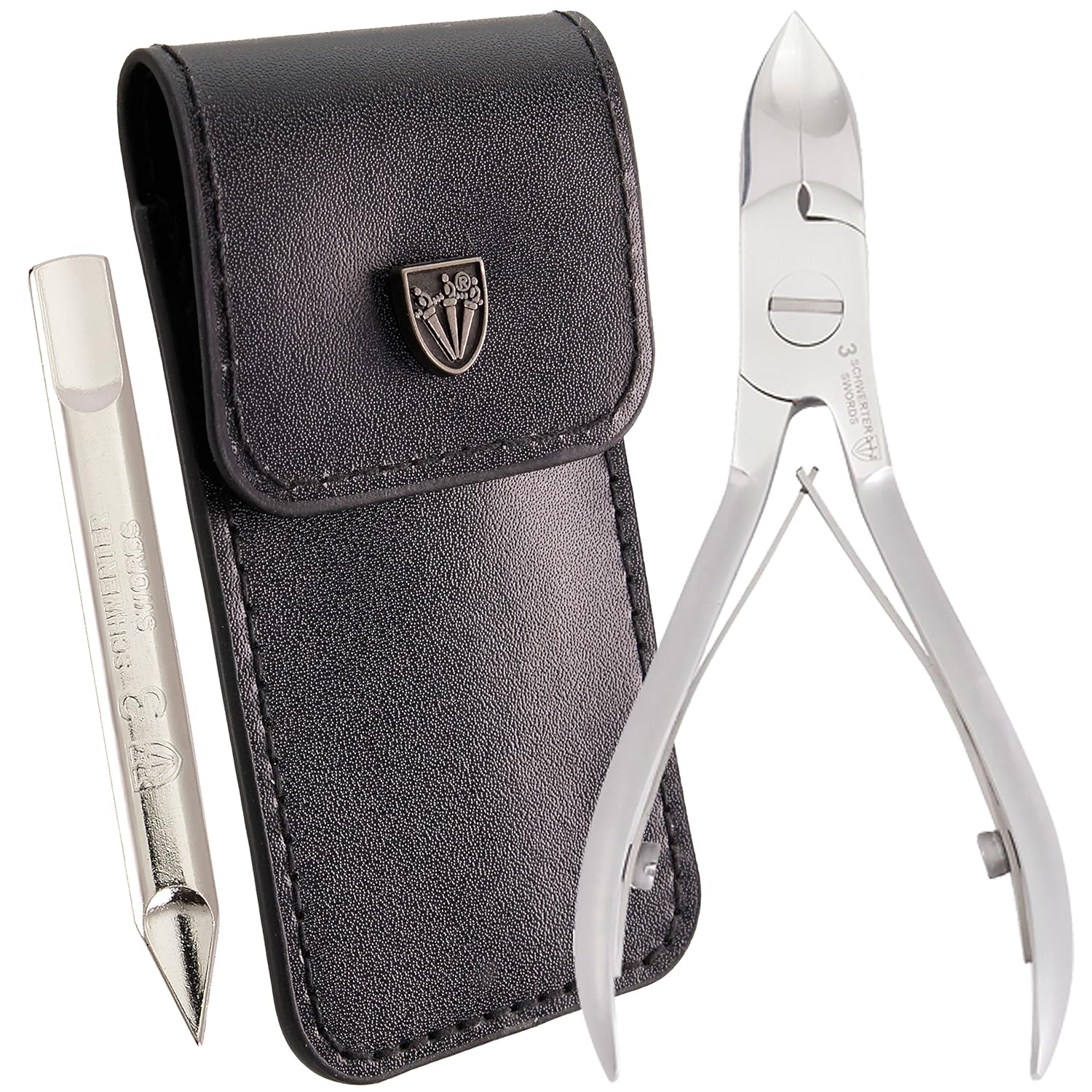 - DELIVERY: 1 Nail nippers 3,7 inch (9,5 cm) for conveniently and neatly removing of finger and toe nails + 1 double instrument. The tools came with an attractive black synthetic leather case.
