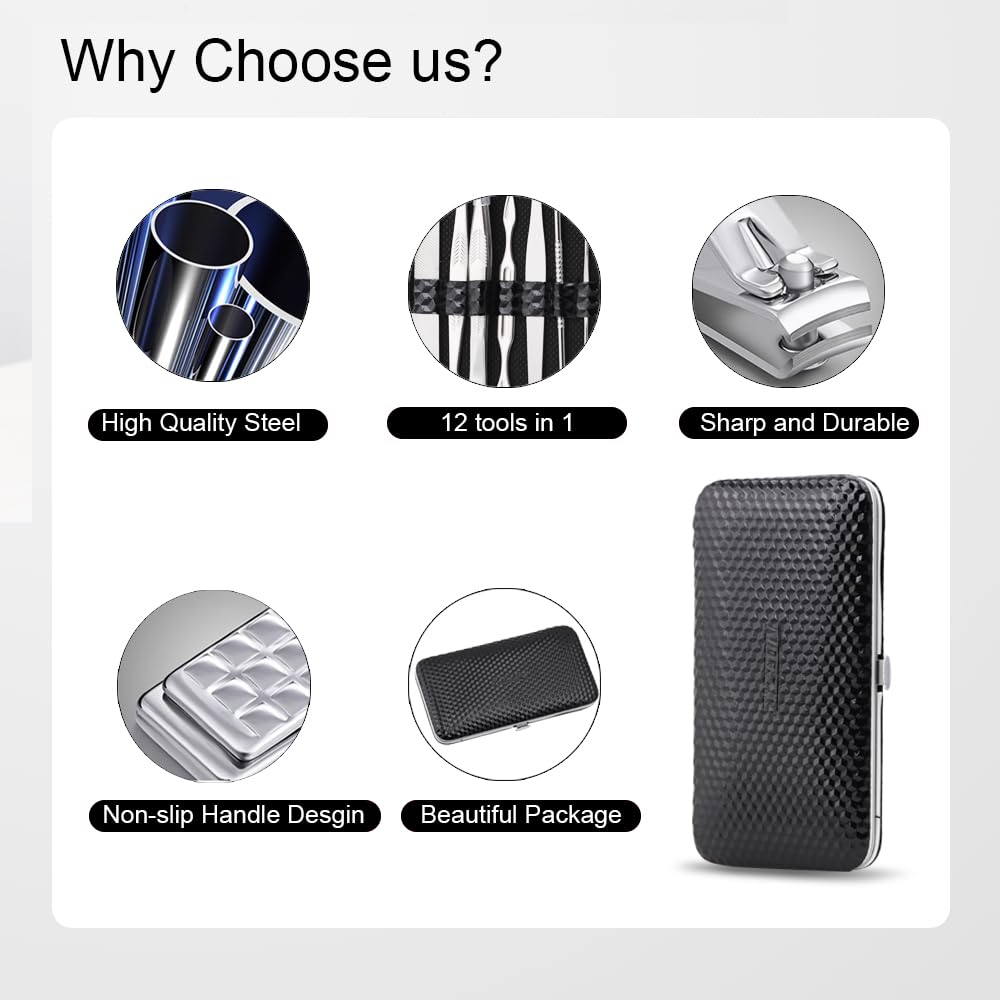 ZIZZON Manicure, Pedicure Kit, Nail Clippers Set of 12Pcs, Professional Grooming Kit, Nail Tools with Luxurious Travel Case Black