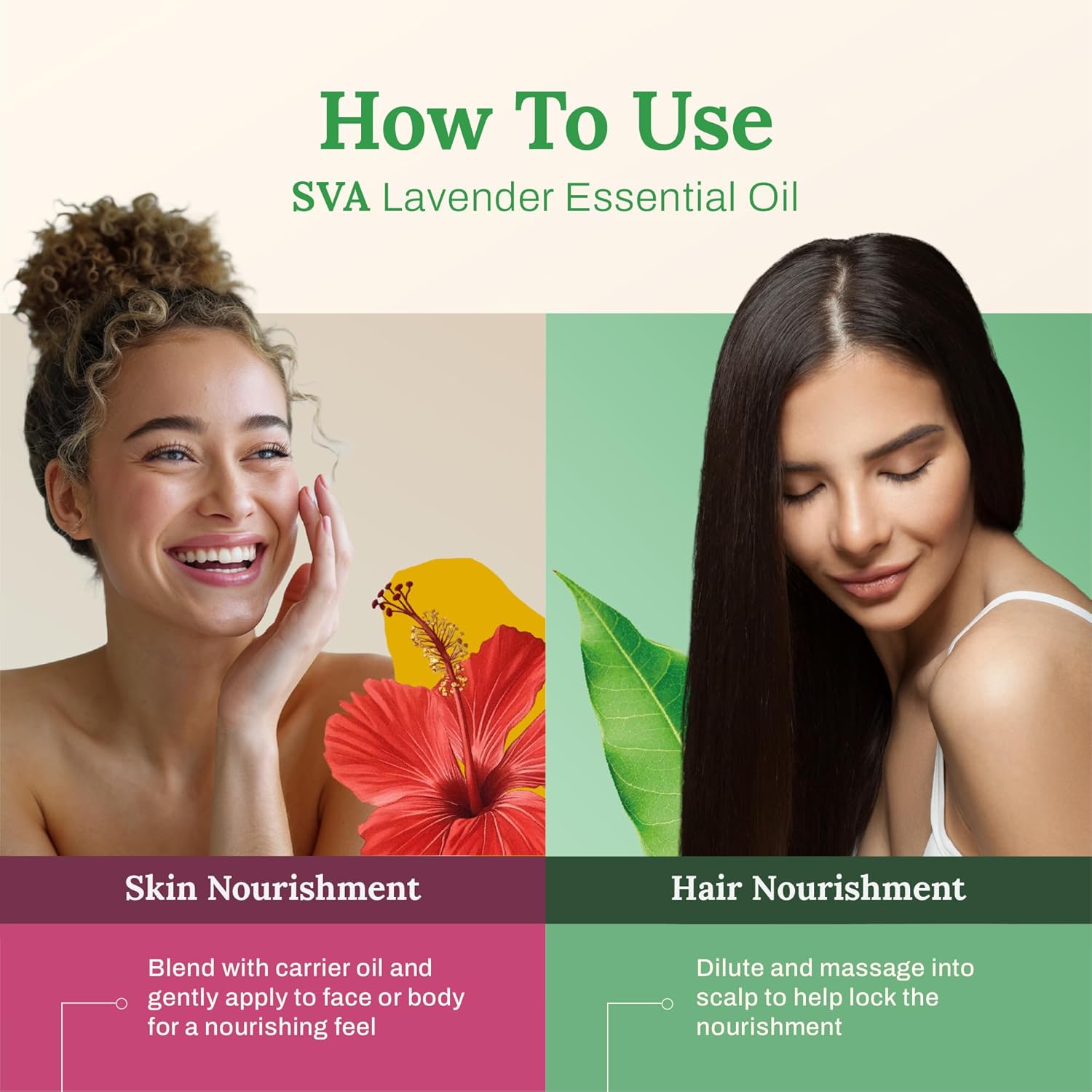 - Skin Nourishment: SVA Lavender Oil is suitable for application on skin and hair. It should always be diluted with a carrier oil before use since it is highly concentrated. There are many ways to use Lavender essential oil for skin. Add a few drops of the oil to your creams, lotions, or bath products to enjoy the goodness of the oil.
