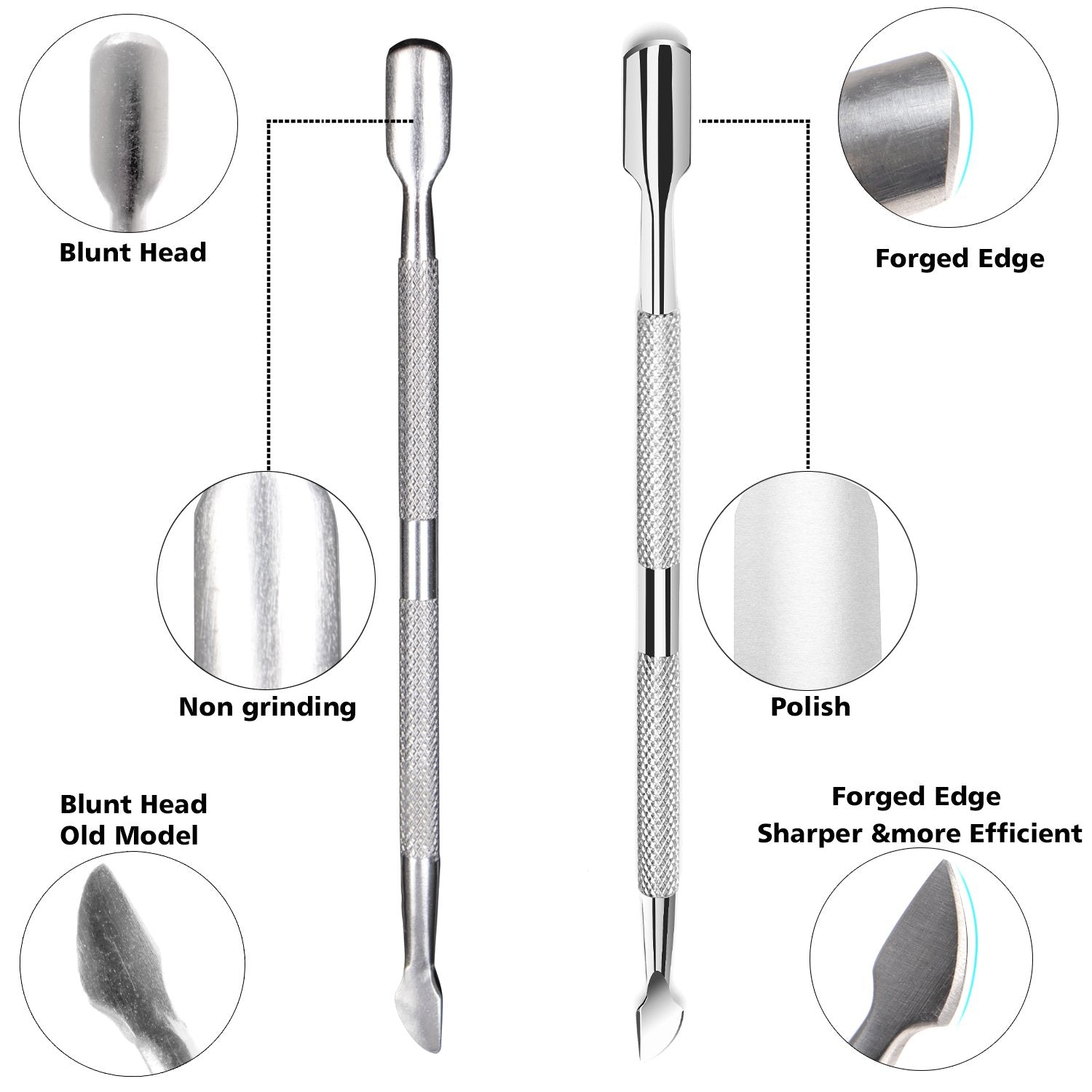 - Dual End Nail Pusher & Perfect for Cuticle Removal: Sharp to cut or scrape away dead cuticle on one end; Curved flat end perfectly pushes the skin back flawlessly; Durable metal resists wear and tarnish