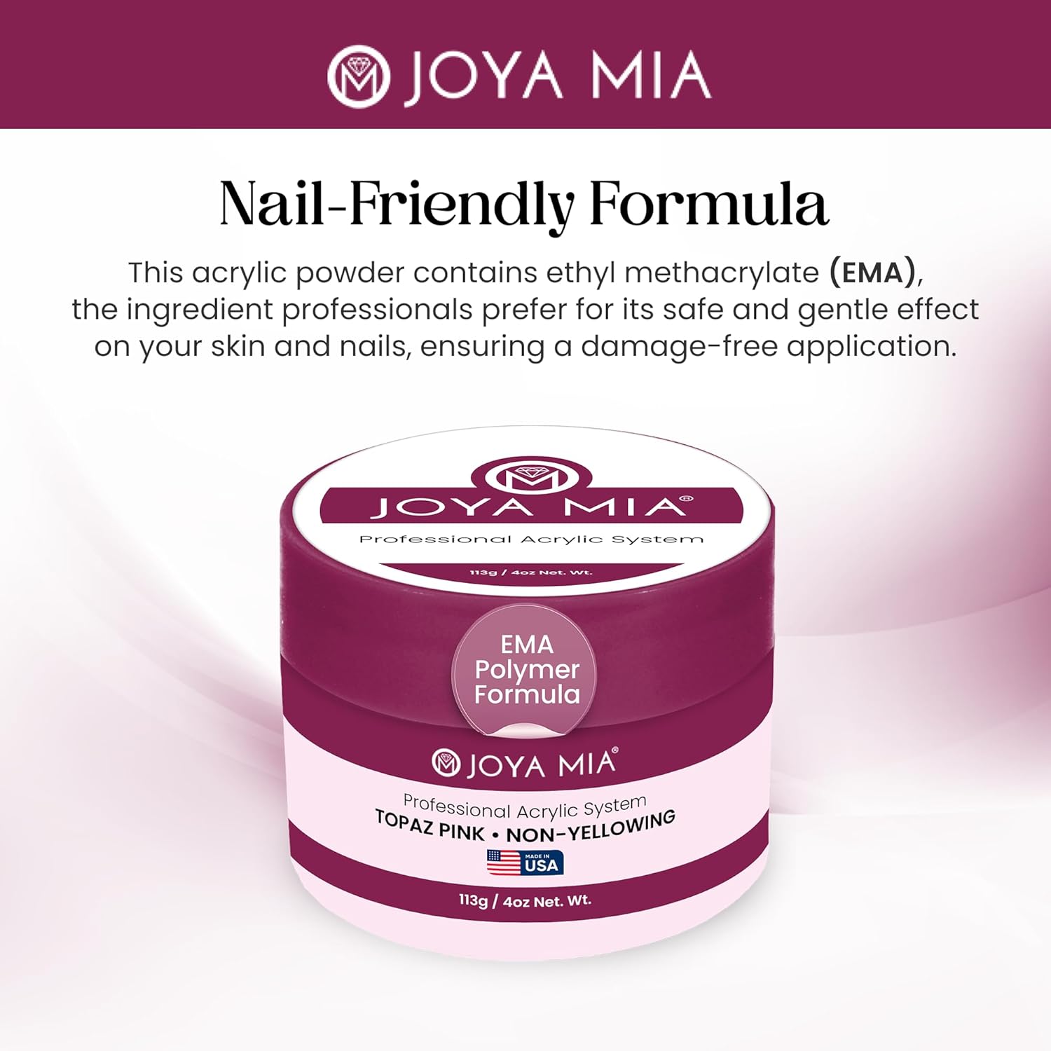 - MMA-Free Formula - Other color acrylic powder may contain harmful chemicals such as methyl methacrylate (MMA). But not Joya Mia products! Our acrylic nails powder is completely MMA-free, so your nails and skin wonβt be exposed to anything damaging.