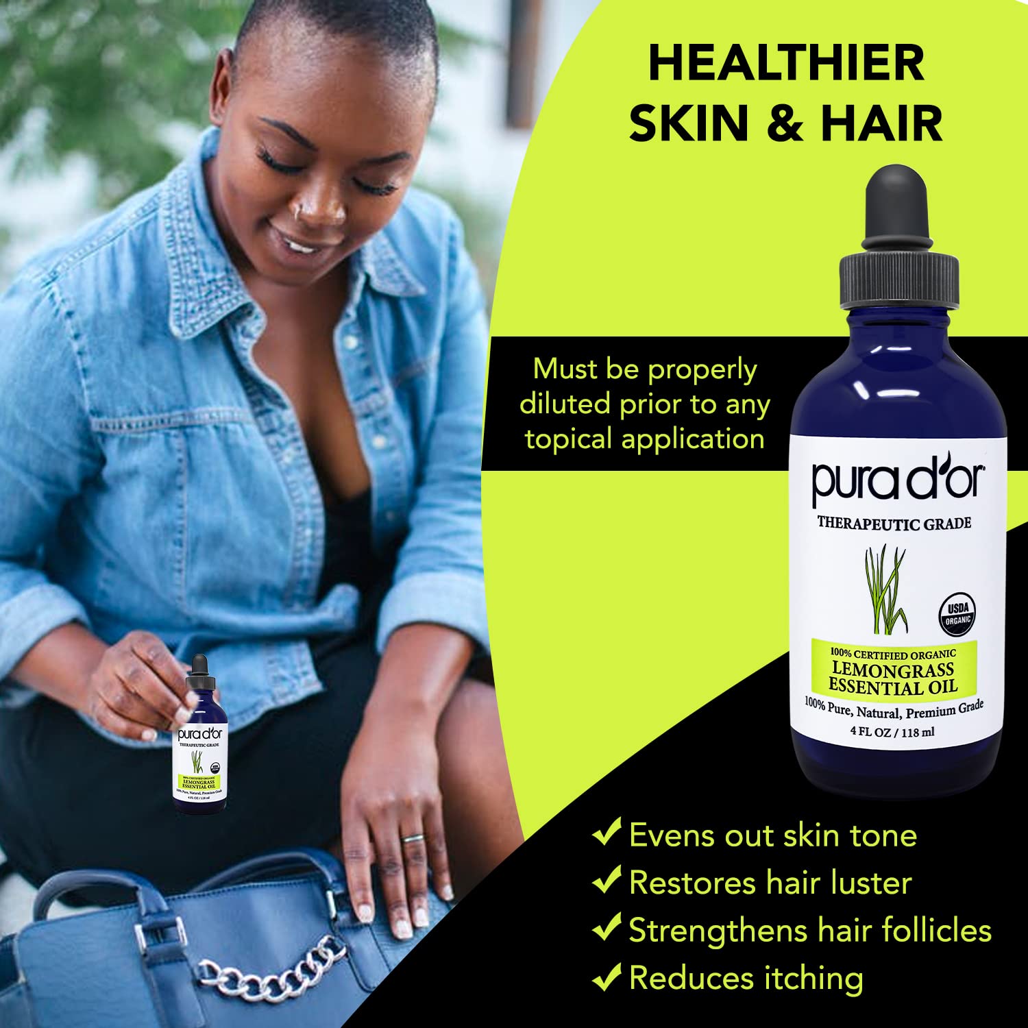 PURA D'OR Organic Lemongrass Essential Oil, 4oz, Therapeutic Grade, for Hair, Body, Skin, Aromatherapy, Relaxation, Massage, Vitality, Home, DIY Soap
