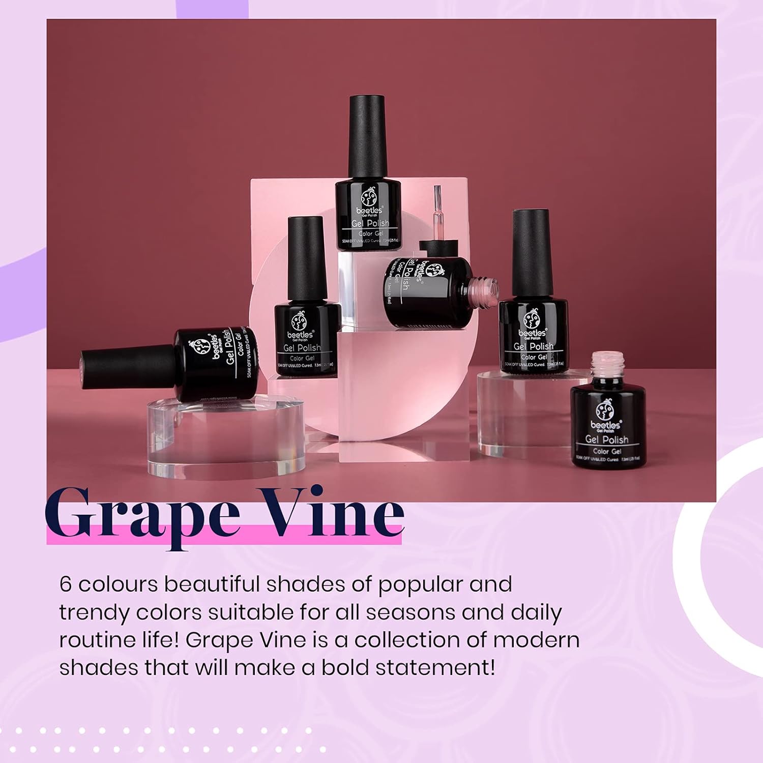 - 【Beetles 6 Colors Gel Polish Set】Any shade of purple is a year-round popular color! It signifies confidence and elegance during any season or occasion! Nail Polish Color Numbers are: 870-871-872-873-874-875, hassle-free and friendly customer service. (PLEASE NOTE: We strive to make our digital color swatches as accurate as possible to the actual product color, but due to different monitor settings and electronic devices, colors may differ slightly.)