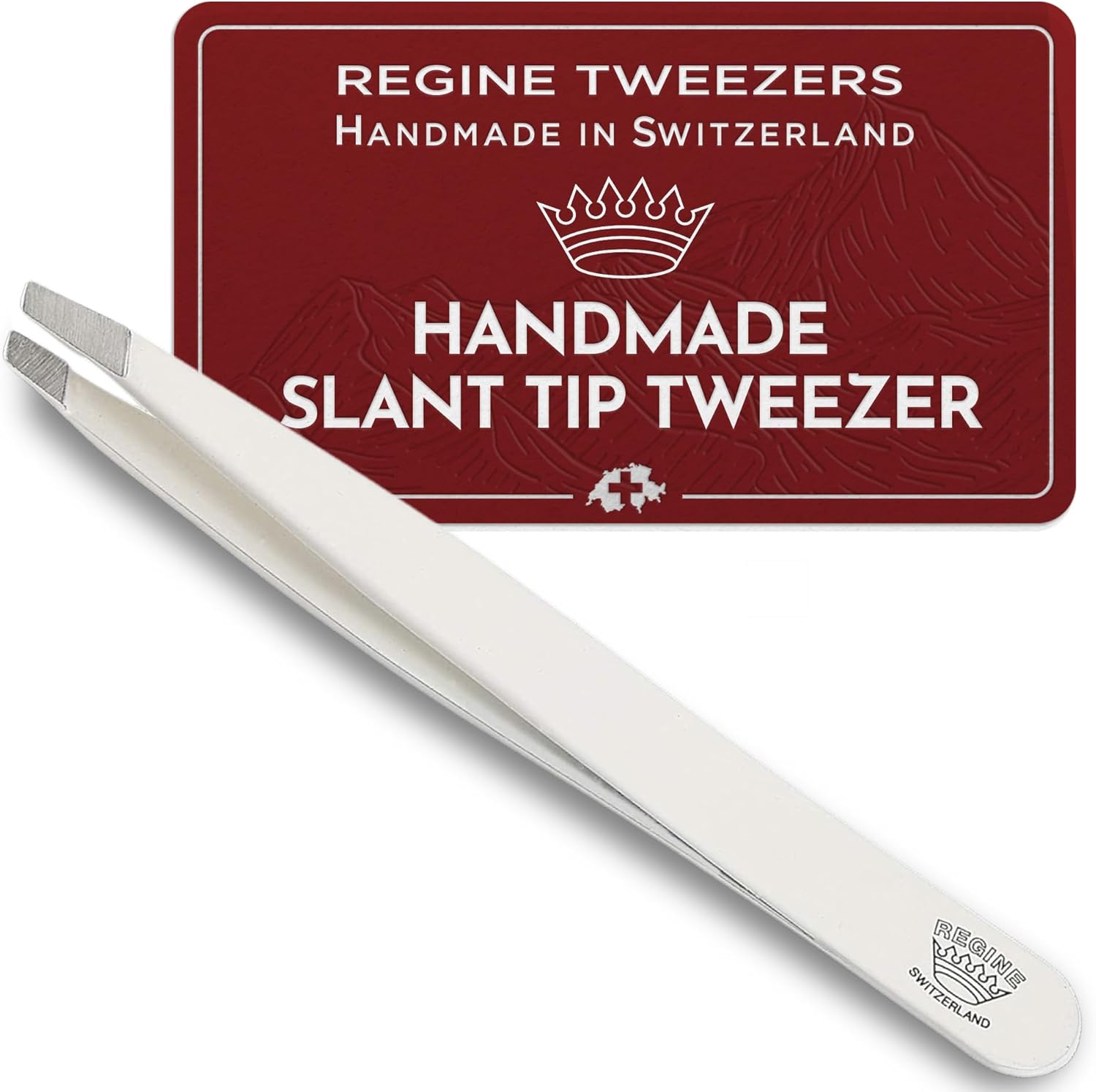 Slant Tweezer - Handmade in Switzerland - Professional Eyebrow & Facial Hair Remover - Etched Interior Grabs Hair from The Root - Perfectly Aligned Tips - Stainless Steel, White