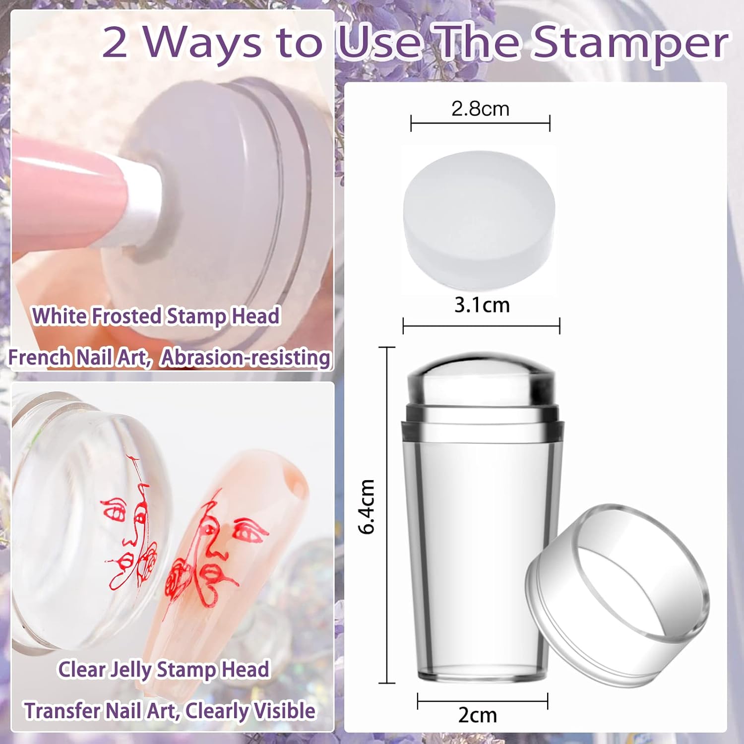 - 【Nail Art Stamper & Scraper】The silicone transparent nail stamper can help you choose the size and position of pattern clearly, and you can see the design and effect on your nail. The clear silicone stamper is flexible and molds smoothly to your nail shape for precise, effortless transfers. Contains 2 different stamp heads for both French Tip and transfer manicure.