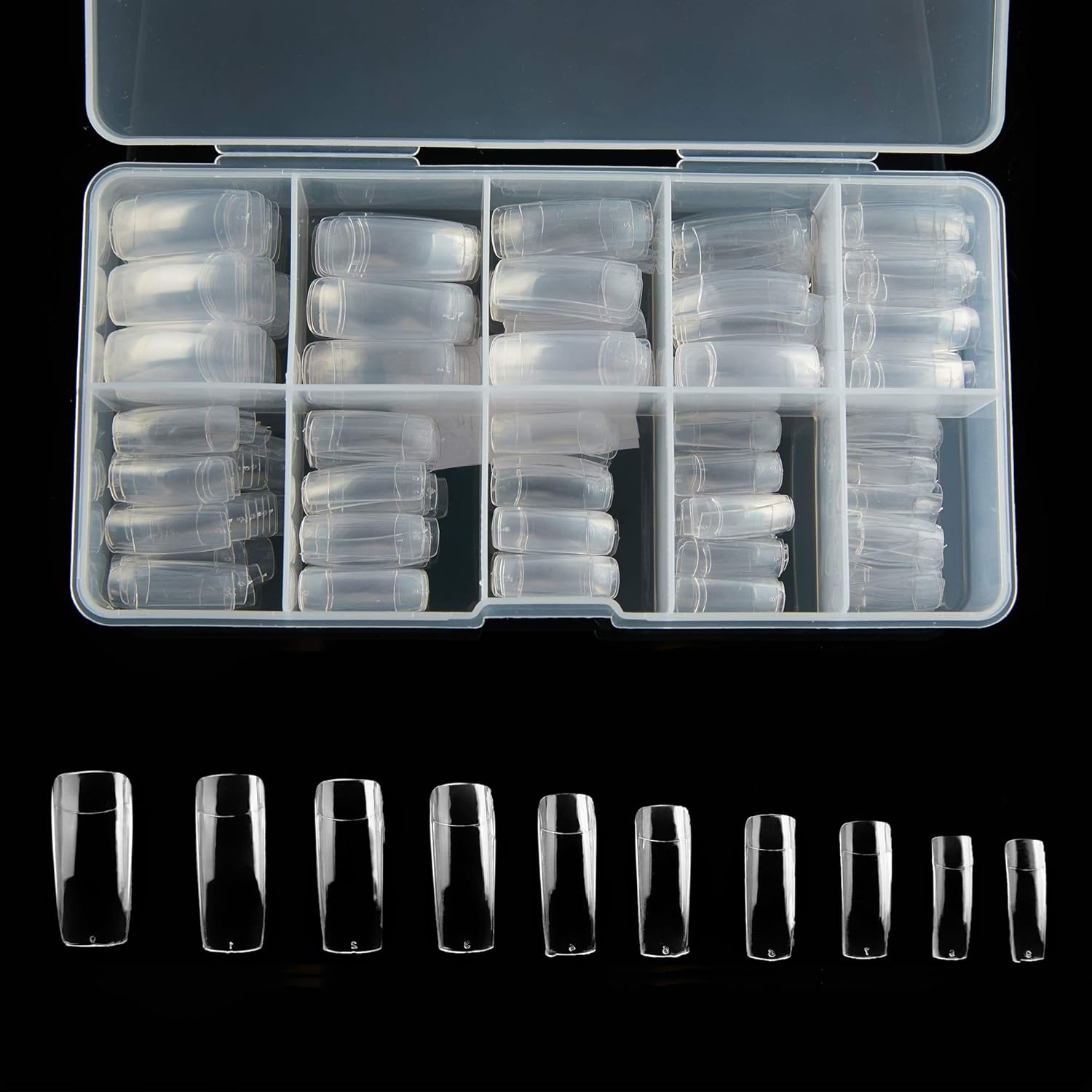 - Half-covered false nail tips, 500pcs nail tips, 10 different sizes, stored in numbered case with 10 small grid.