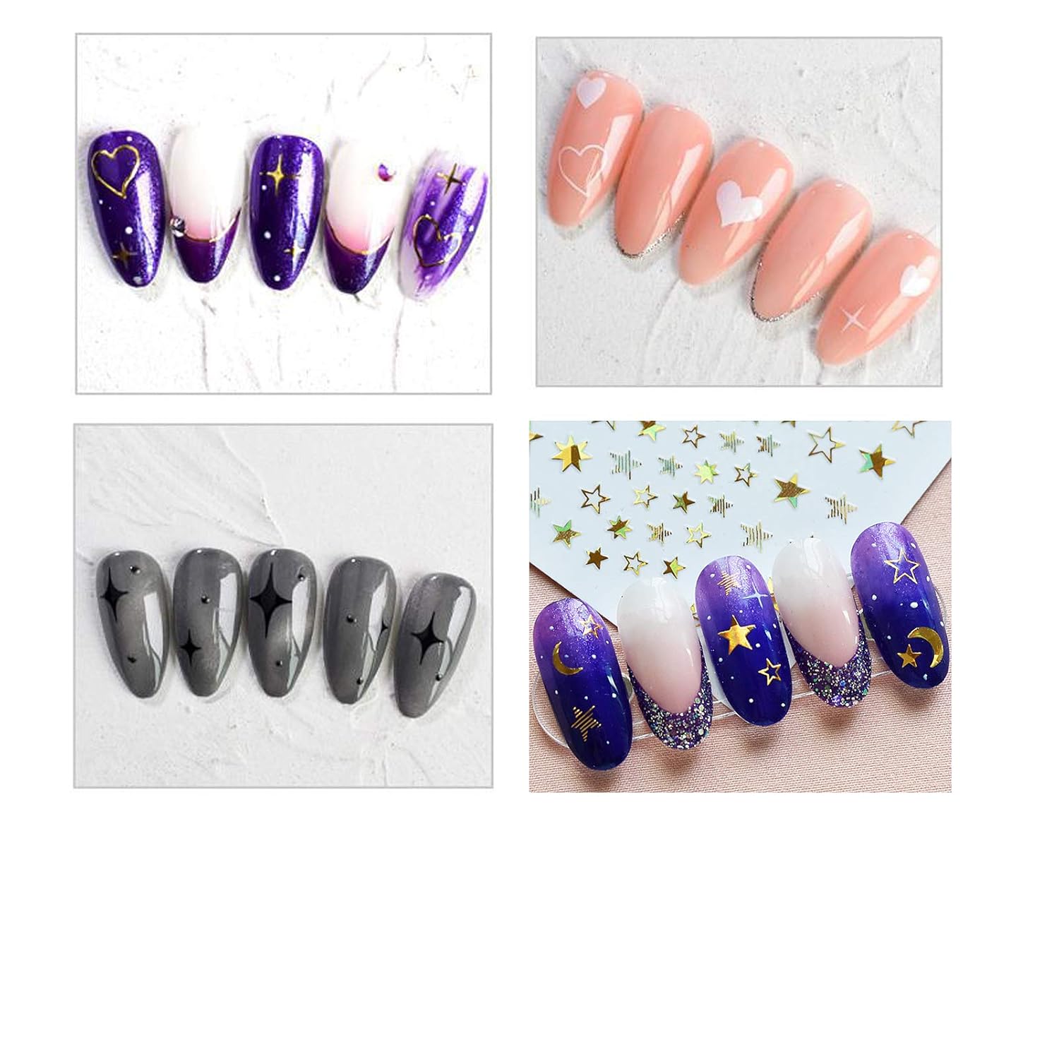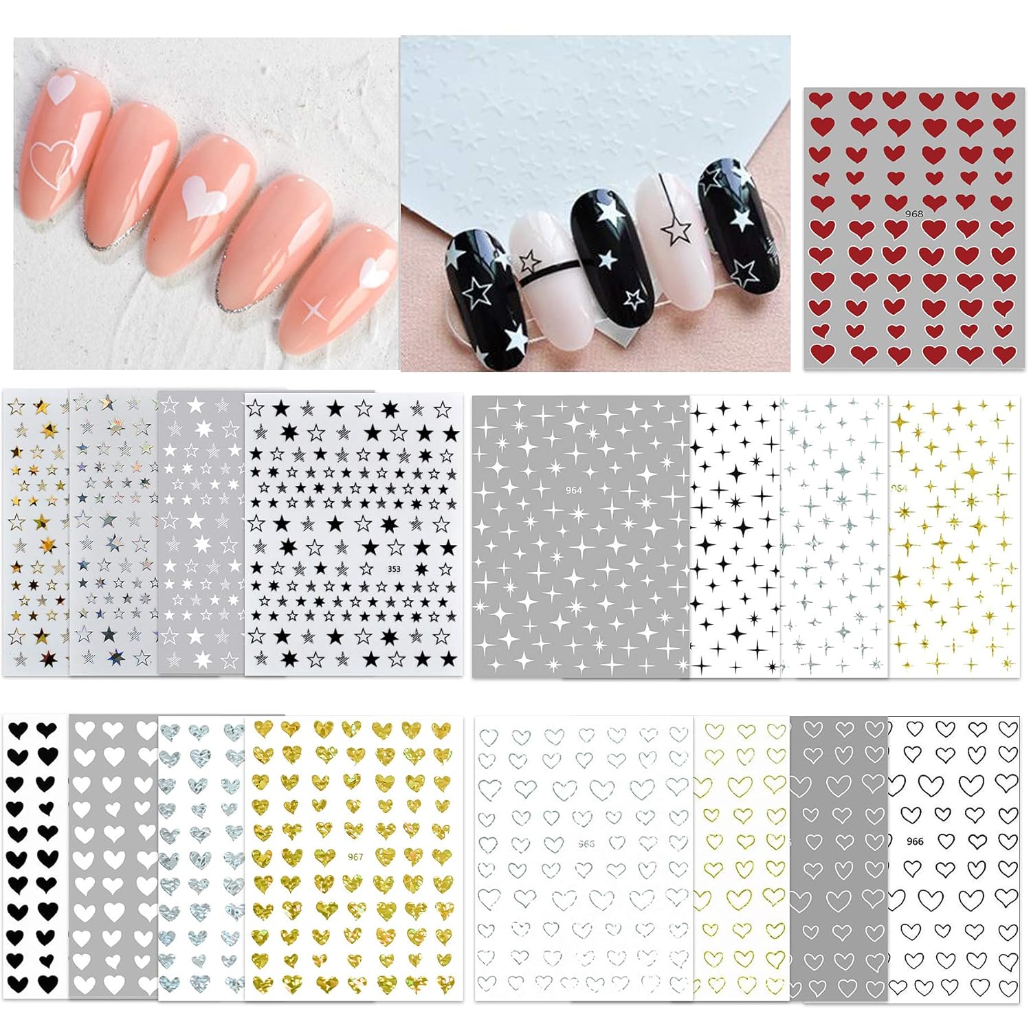 - This heart and star nail art sticker set includes 8 sheets of star nail stickers and 9 sheets of heart nail stickers.