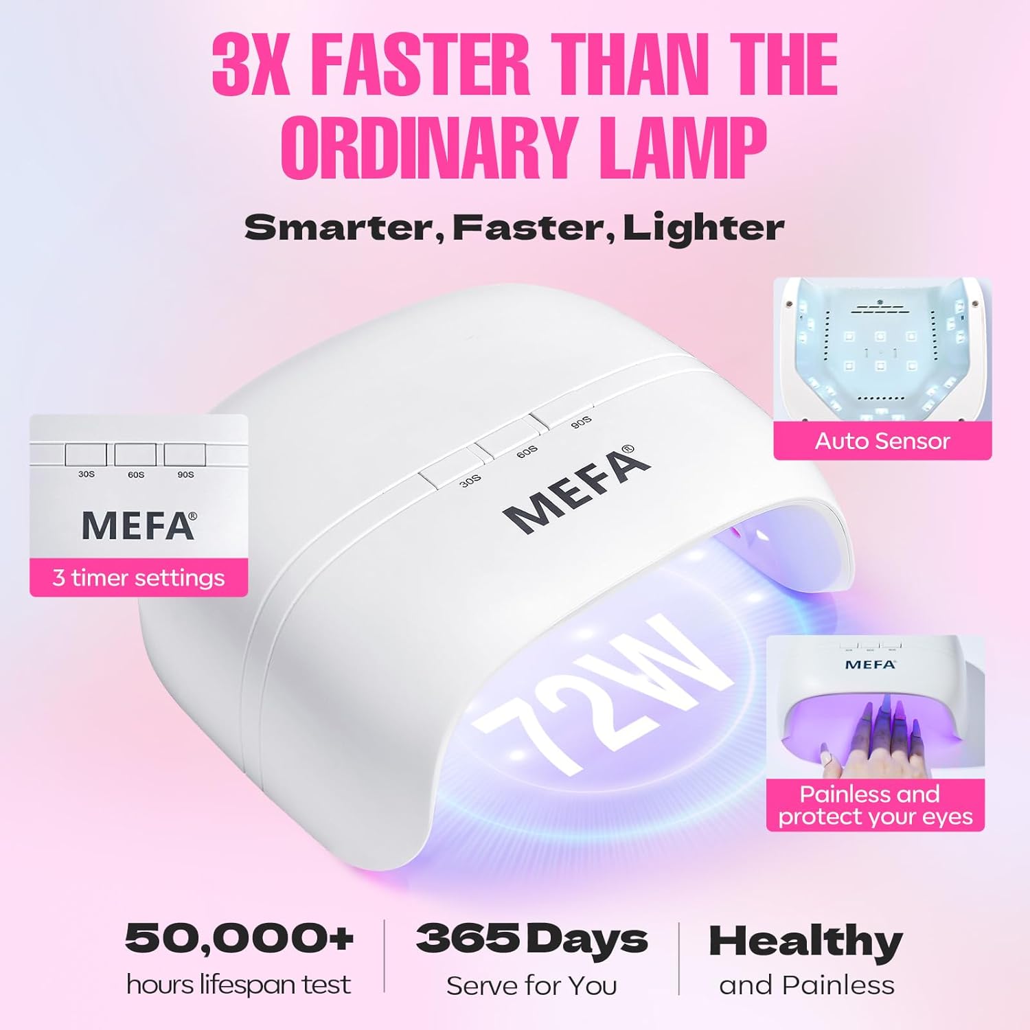 - Quick Drying Nail Lamp: The 72W lamp dries nails efficiently with three timing settings (30s/60s/90s), save time by drying twice as fast; its automatic smart control turns on when your hand is in and off when removed, enjoy hassle-free nail art manicures
