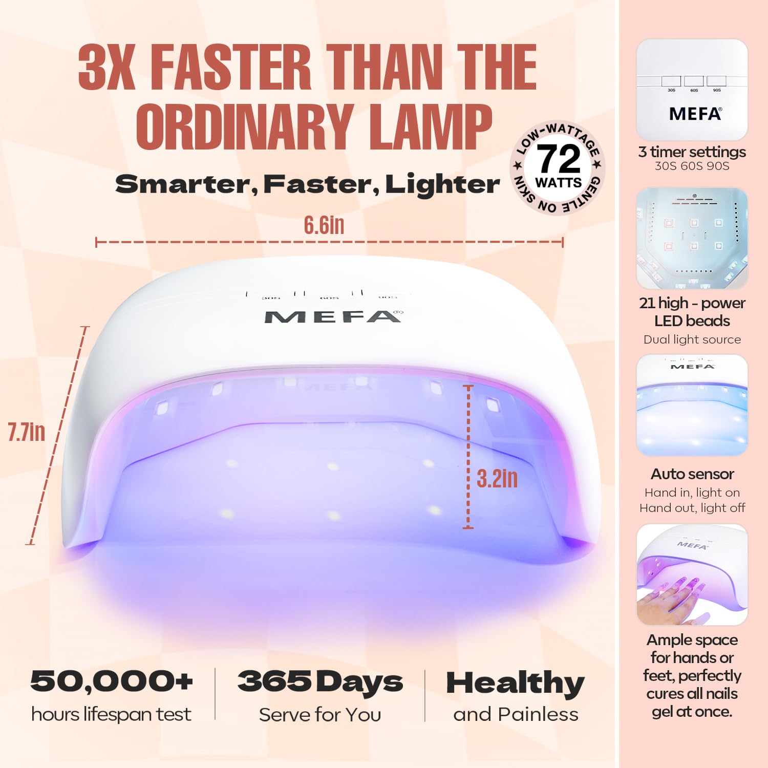 - Rapid 72W Nail Lamp: The lamp dries nails efficiently with three timing settings (30s/60s/91s), save time by drying twice as fast; its automatic smart control turns on when your hand is in and off when removed, enjoy hassle-free nail art manicures