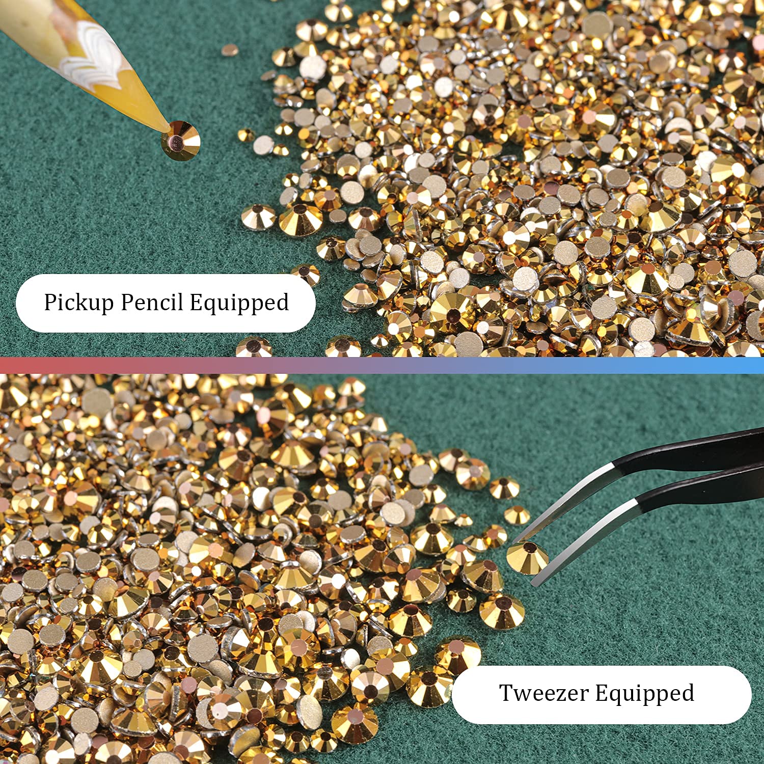 6 Sizes Gold Glass Crystal Kit with Pickup Pen + Tweezer Tools for Shine Nail Art Manicure Makeup DIY Decoration Flatback Round Rhinestone Gem Jewelry Diamond