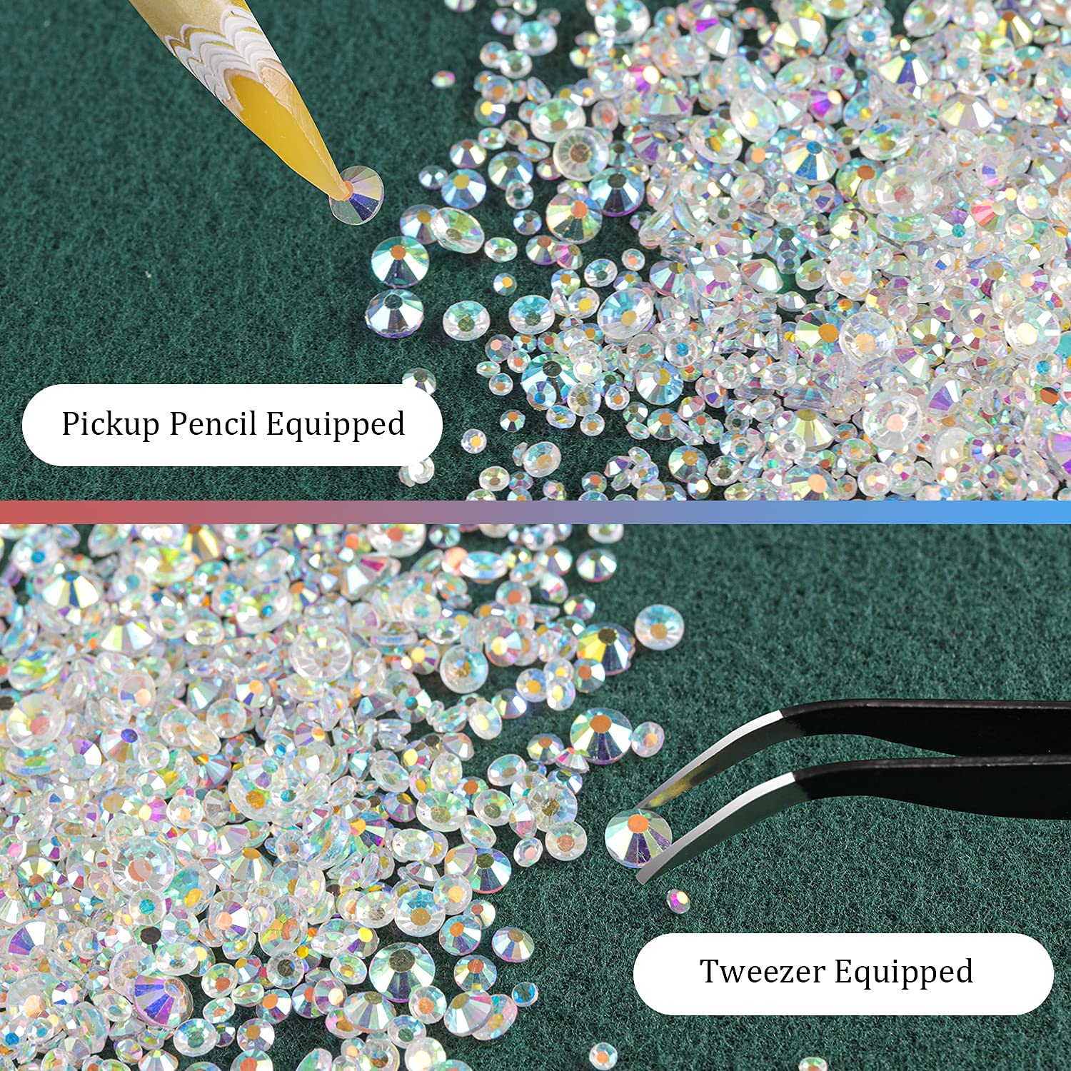 - ❤HELPFUL PICK-UP TOOLS -- The Tools Can Be Used for Multi-Function, including Round and Multi-shaped Crystals, or Flatback or Non-Flatback Crystals. After Applying Nail Polish, Just Simply Use the Equipped Tools ( Pickup Pencil + Tweezer ) to Pick Up the Crystals onto Your Nails to Create Your Fabulous DIY Designs! They Are Very Helpful in Picking Up Small Crystals. Just Make Sure You Make the Rhinestones Face up First Before You Start Working on Your Nails.